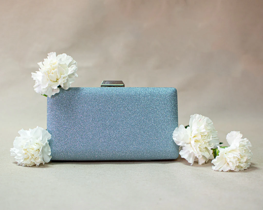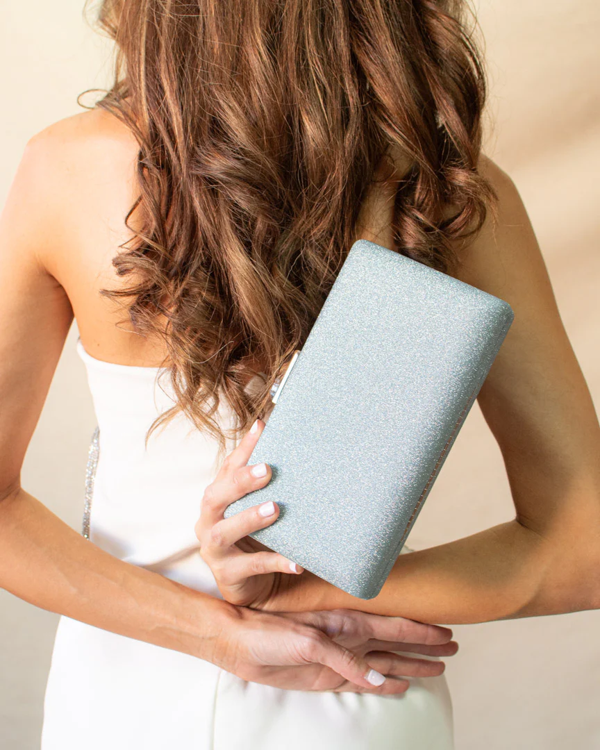 Clutch r铆gido en ante color amarillo-Verde fl煤or, lleva una aplicaci贸n joya en un lateral. Incluye cadena dorada para colgar.