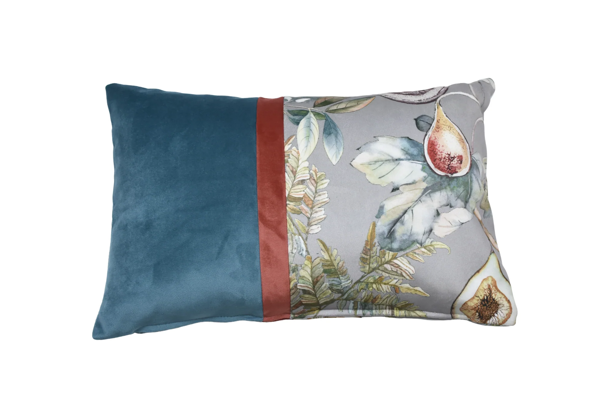 Cojín terciopelo mitad liso mitad estampado.