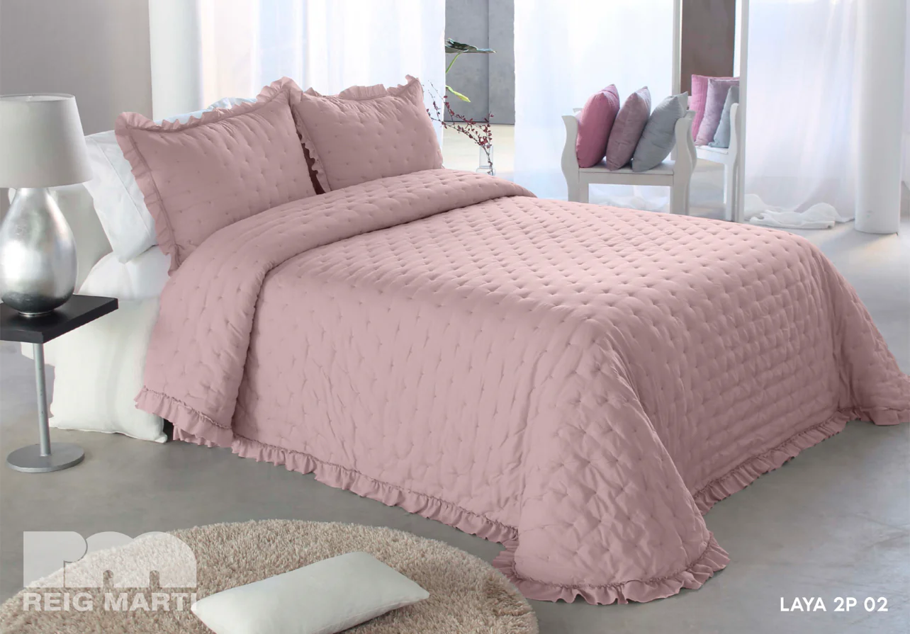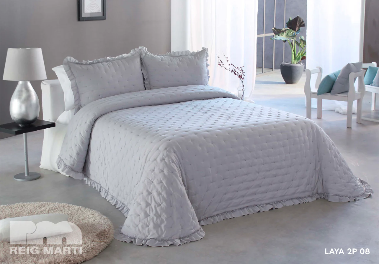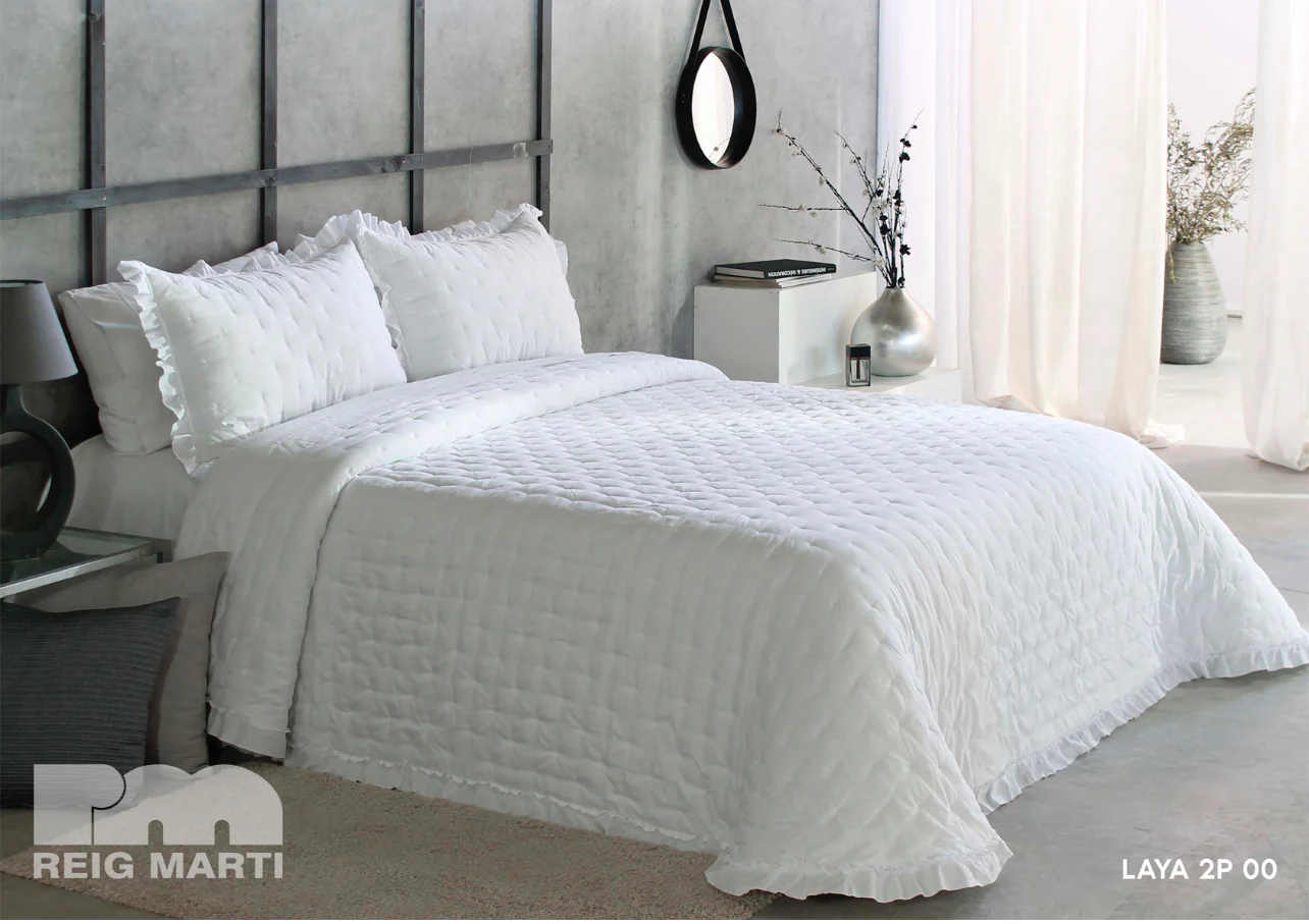 Colcha Bouti Reig Mart铆 Capiton茅, lleva un puntito bordado de la misma tonalidad y un volante que bordea toda la colcha. Cojines incluidos ; 50x70cm aproximados.