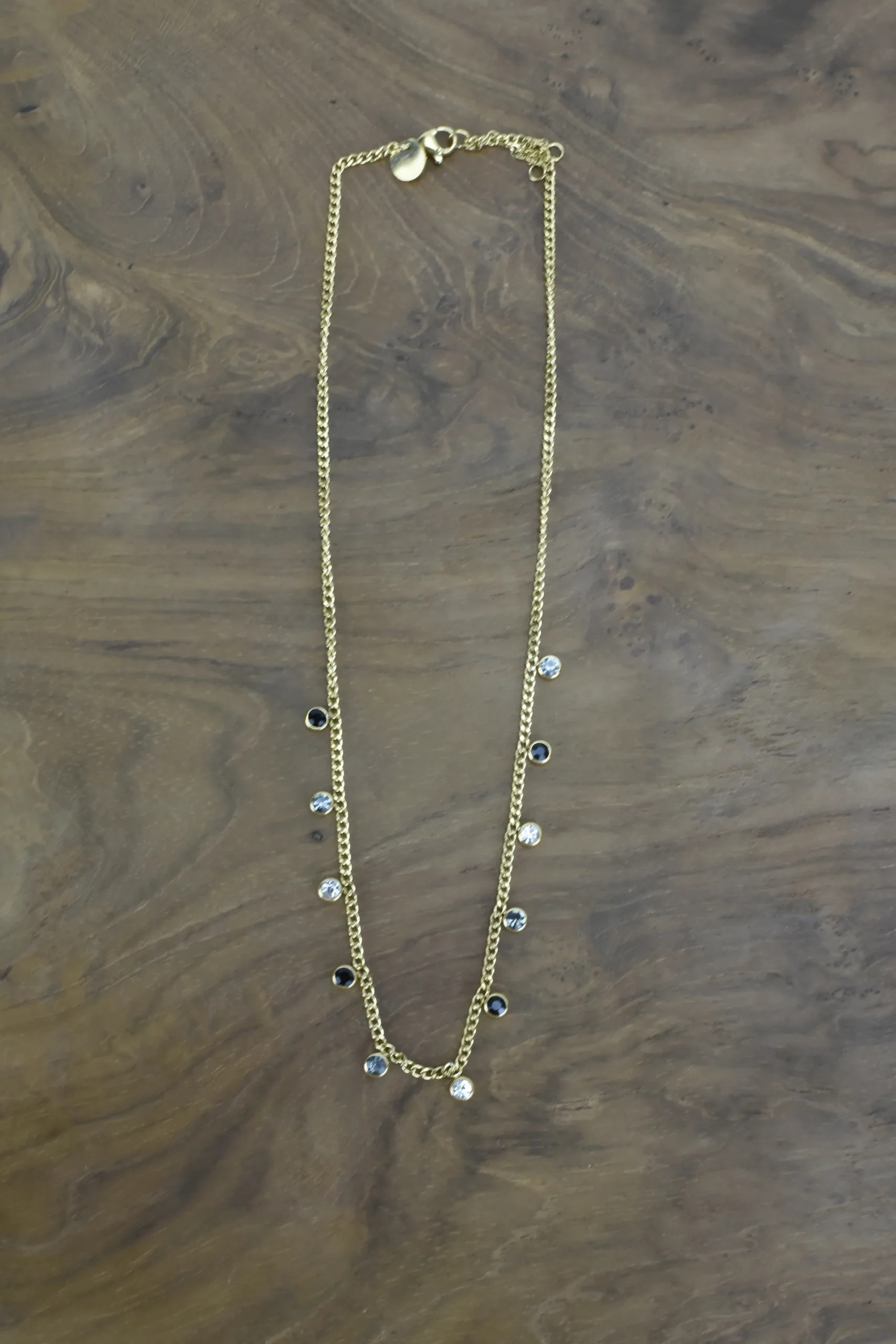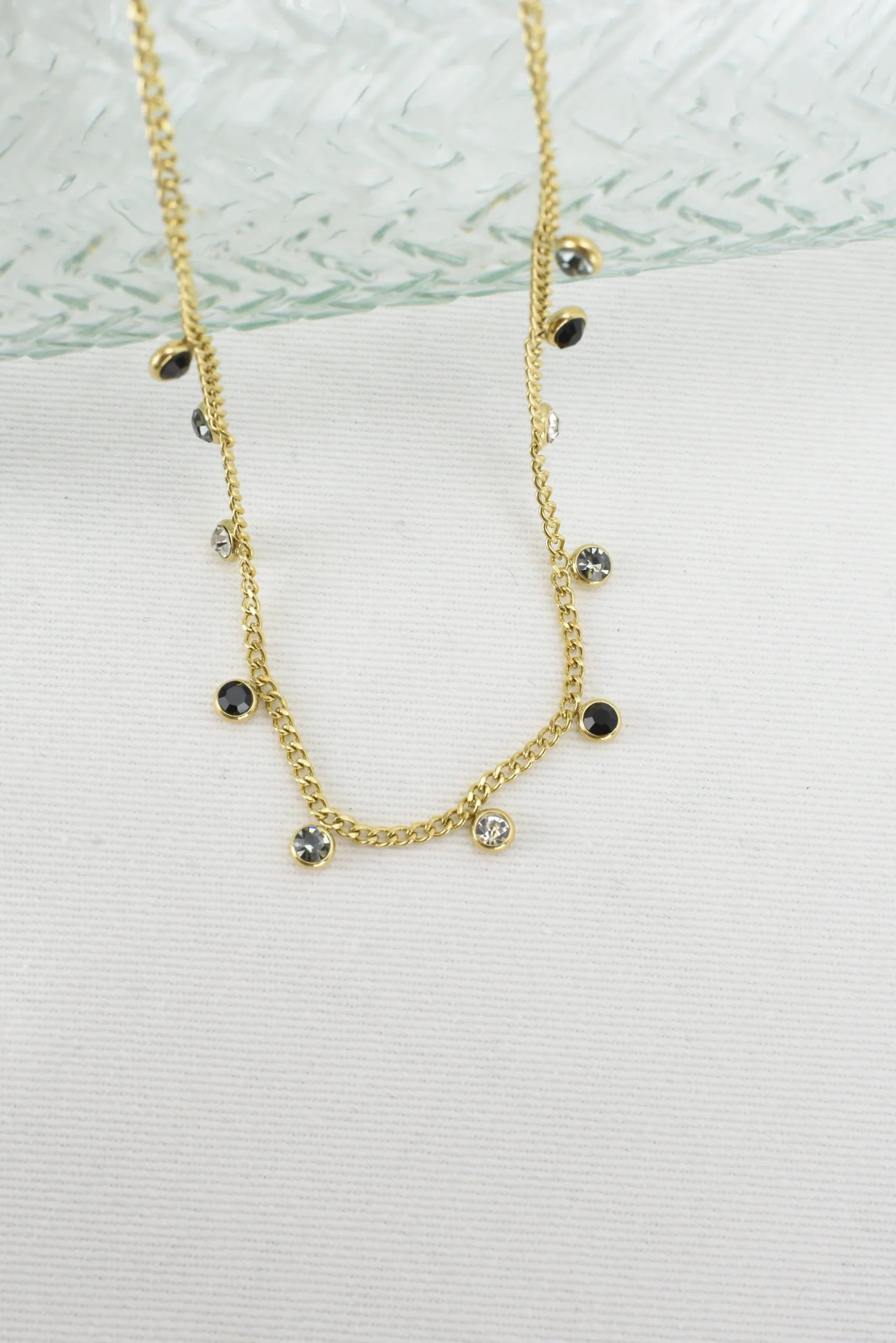 Colgante gargantilla de cadena en acero y cristales en tonos negros y grises , con un ba帽o en oro . Medida de 40cm a 45cm aproximadamente.