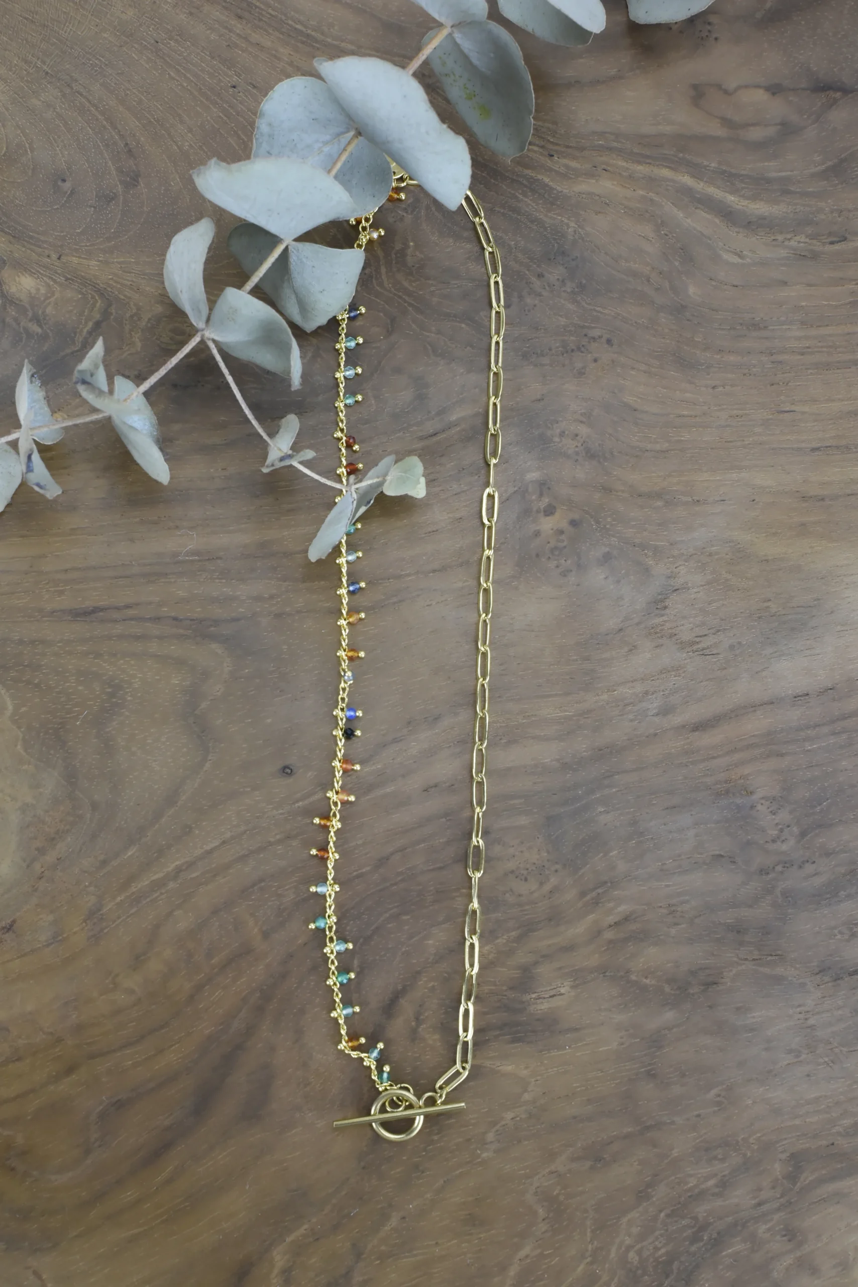 Colgante gargantilla de cadena en acero y rocallas multicolor, con un ba帽o en oro . Medida de 40cm a 45cm aproximadamente.
