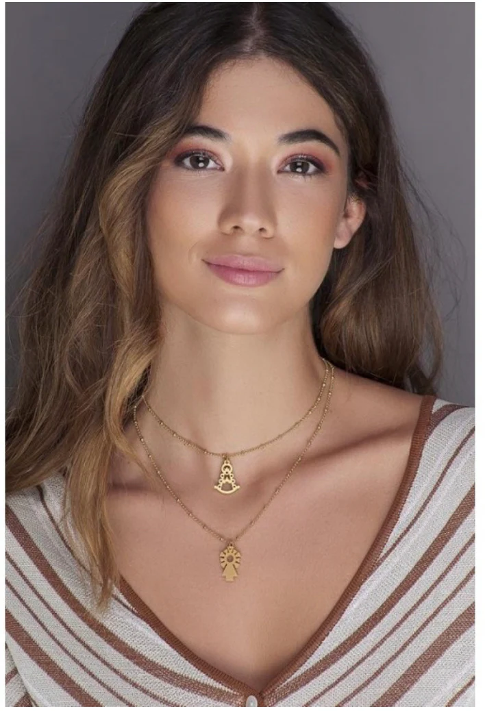 Todas las fornituras met谩licas llevan ba帽o de oro. Se trata de un producto de bisuter铆a y por eso se recomienda no mojarlo.