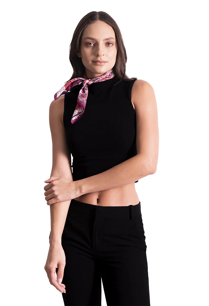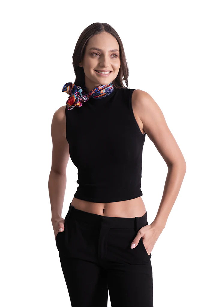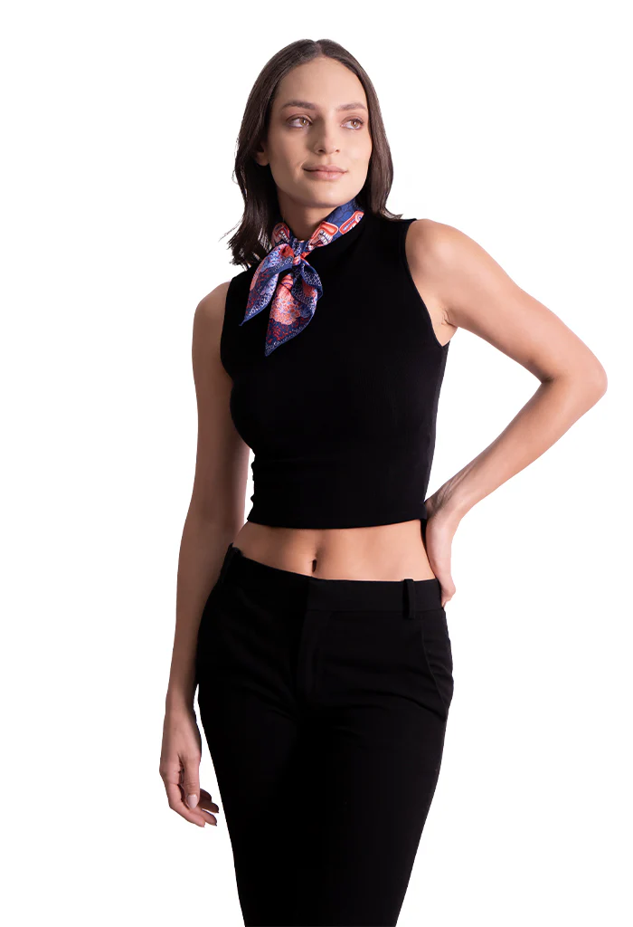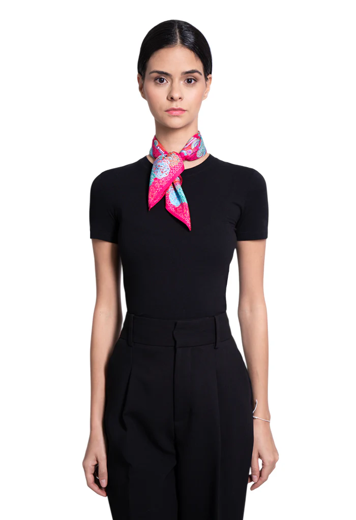 Mascada cuadrada con orilla enrollada y cosida a mano.