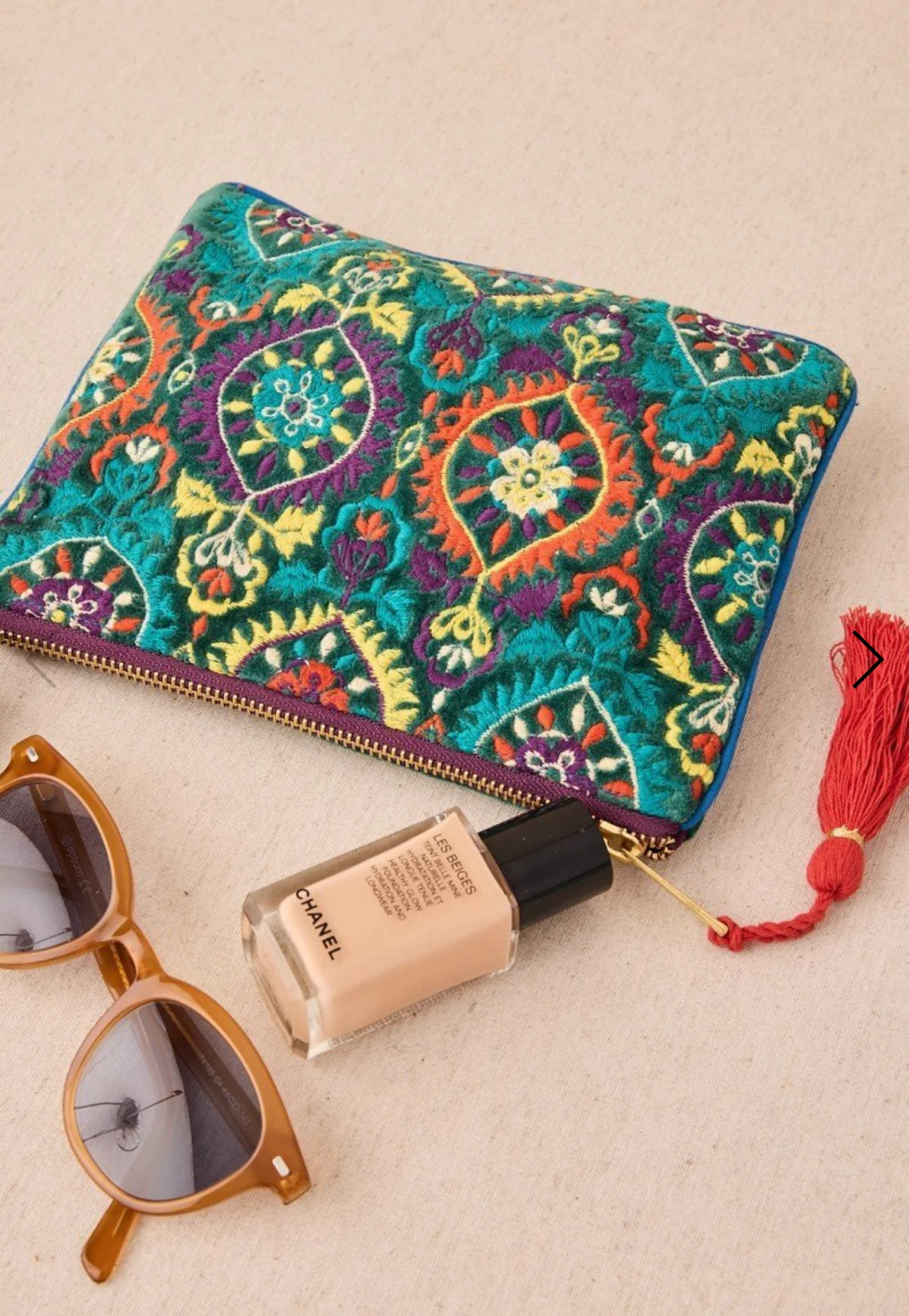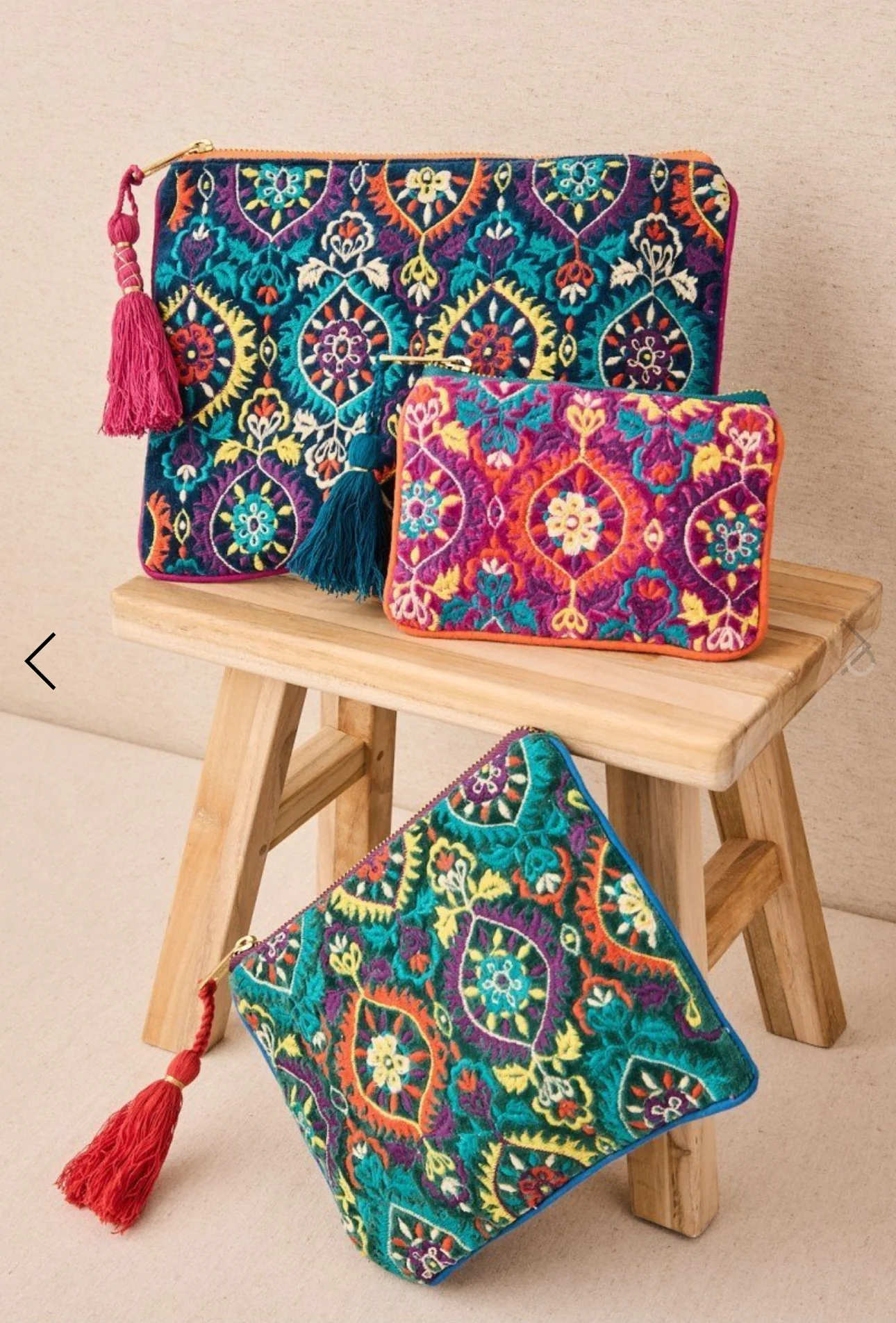 Bolsita de terciopelo con bordado floral en tonos vivos sobre fondo azul noche. Cierre de cremallera con borla y tama帽o perfecto para iPad o documentos. Sofisticada, pr谩ctica y 煤nica.
