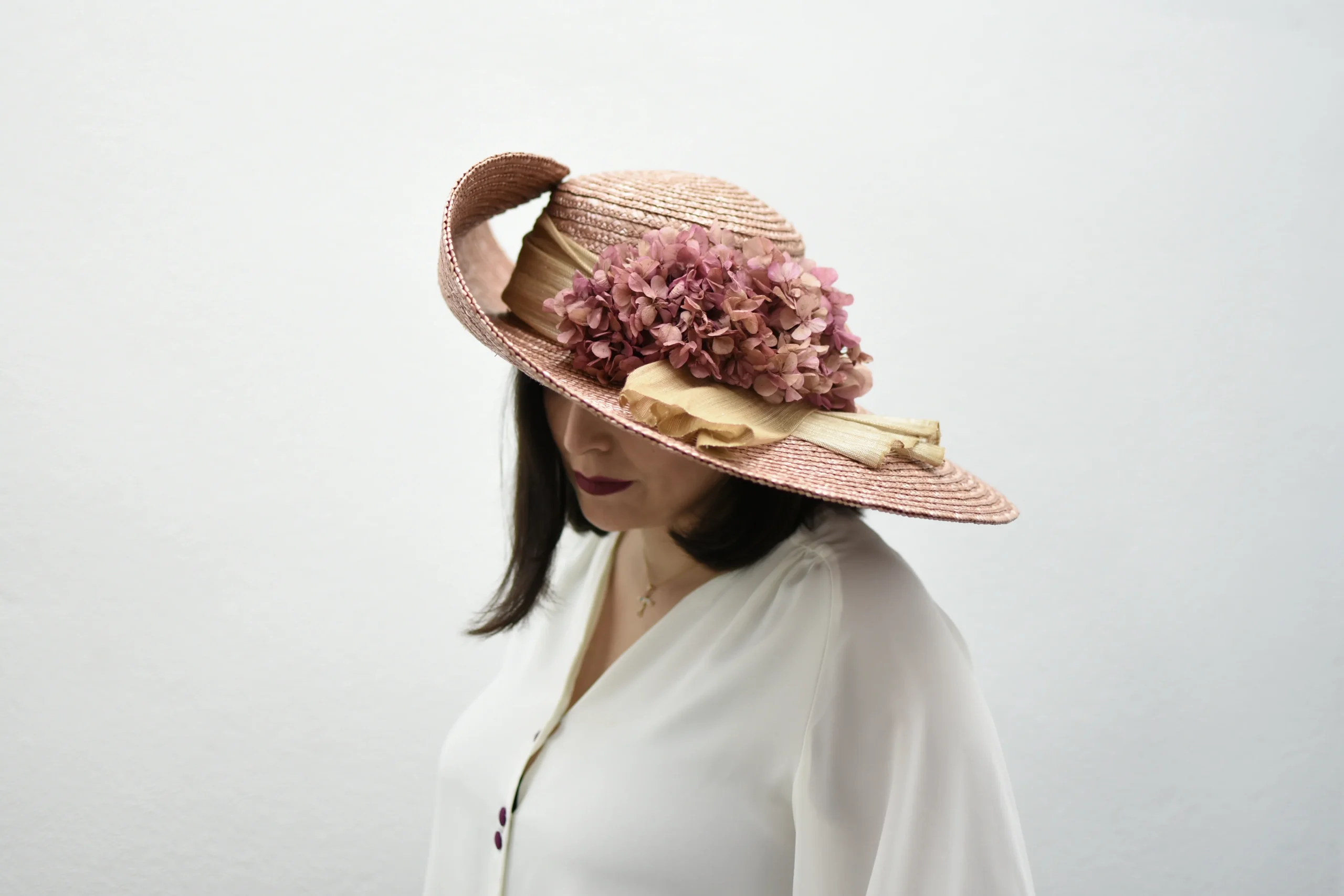 Pamela elaborada en paja de color rosa empolvado, con lazo de sinamay seda y adornos de hortensias preservadas. Ala volada con opci贸n de quitar.