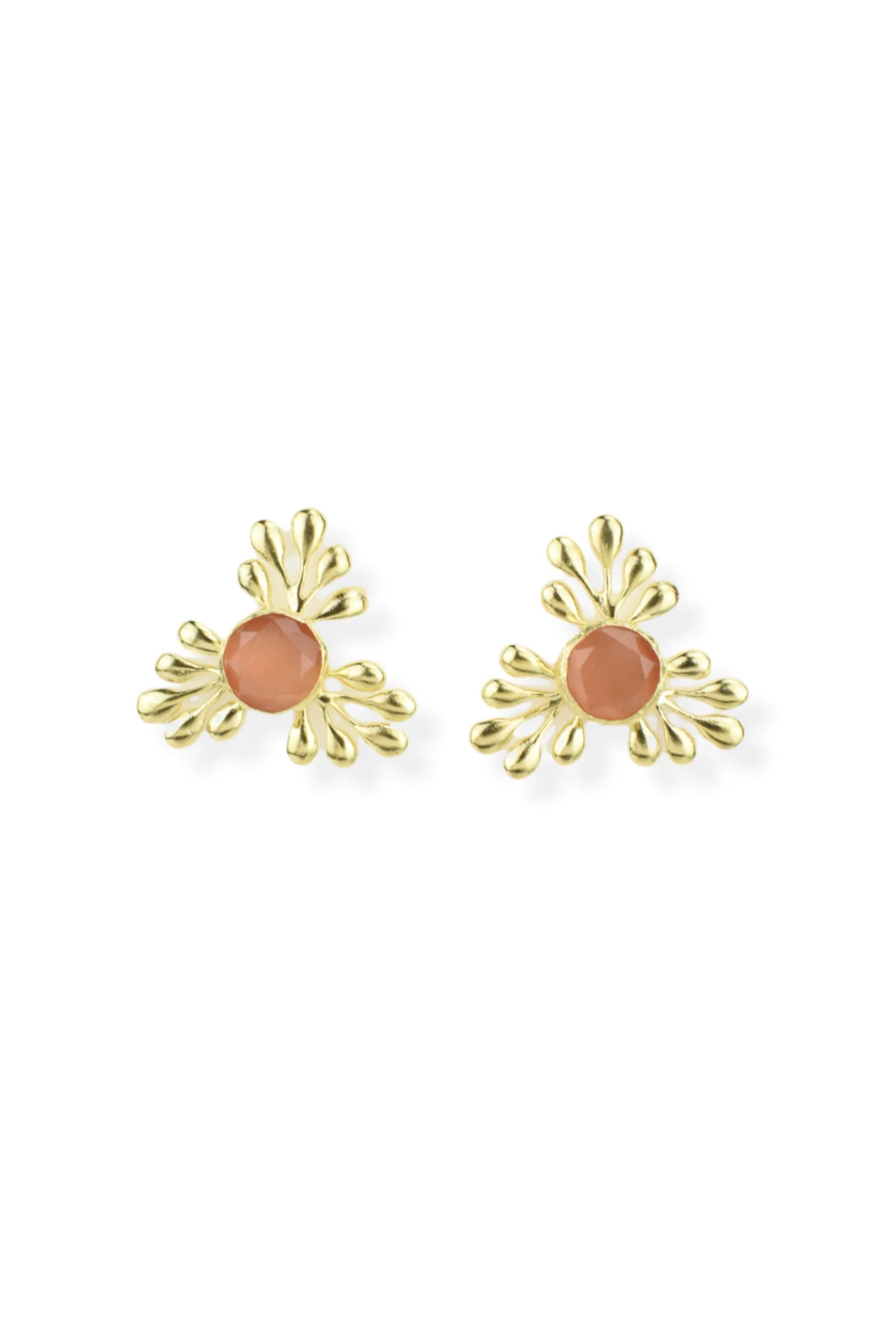 Pendientes hecho a mano con bronce chapado y bañados en oro de 24k con piedra en rojo naranja.