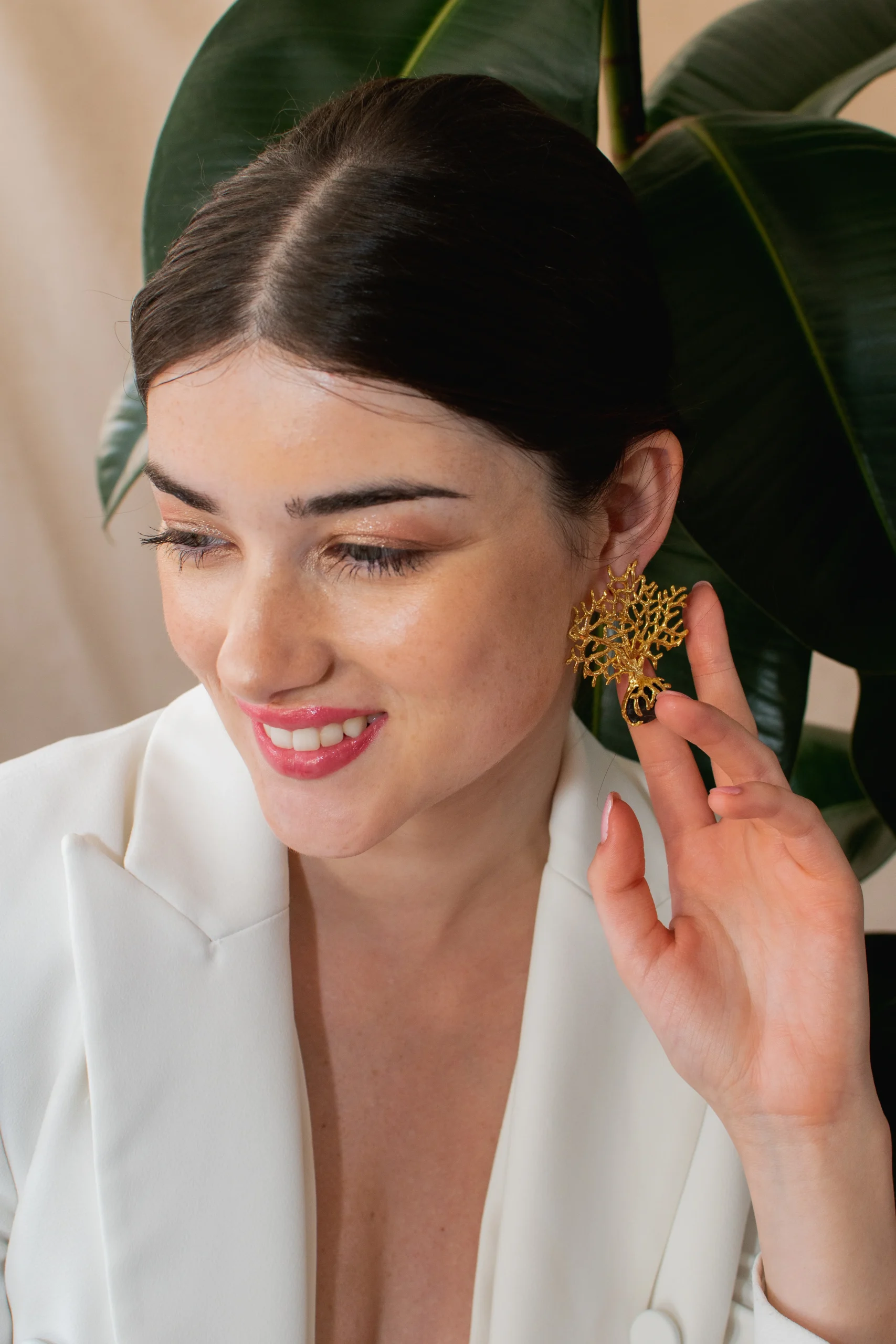 Pendiente hecho a mano en bronce chapado con un baño en oro de 24k.