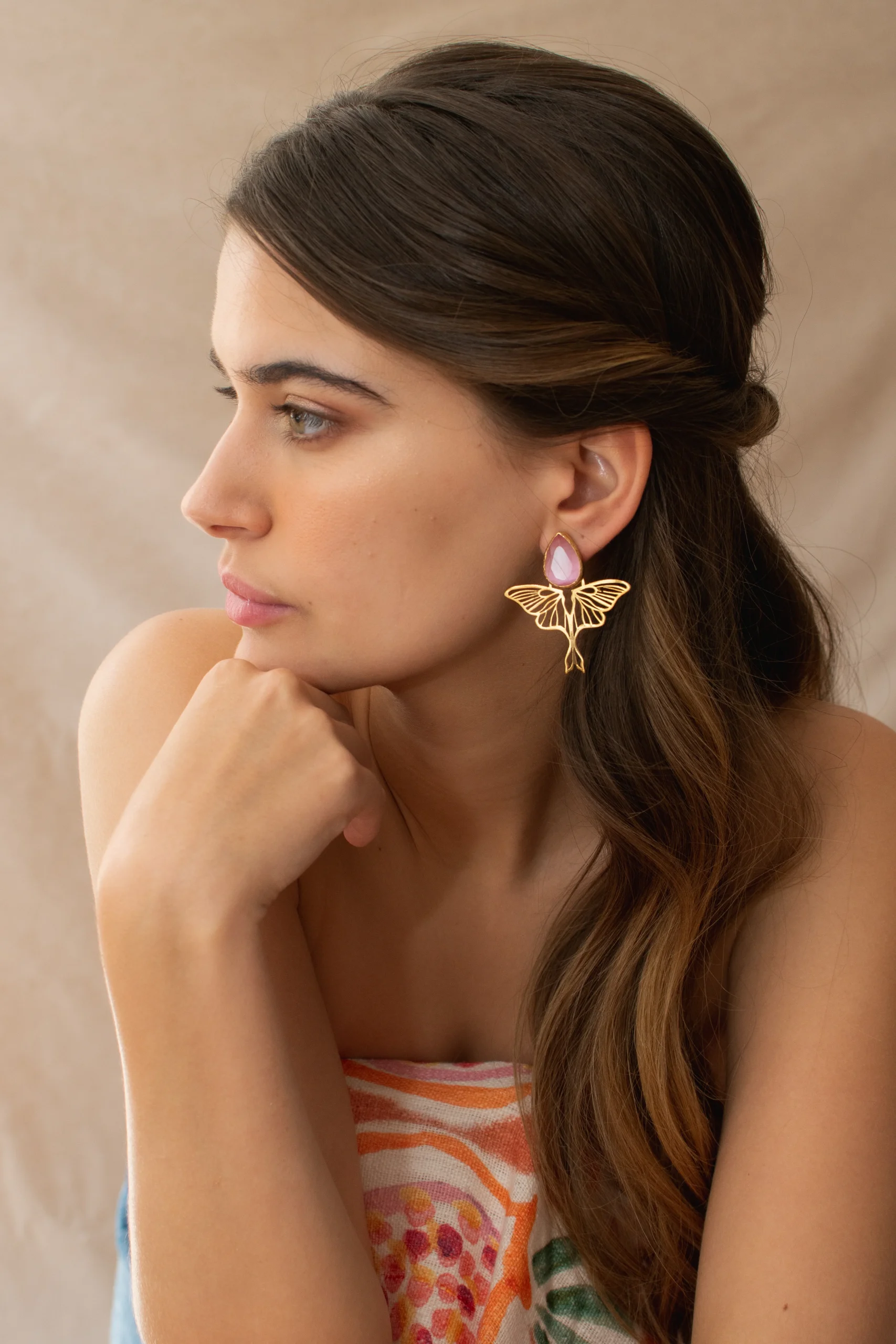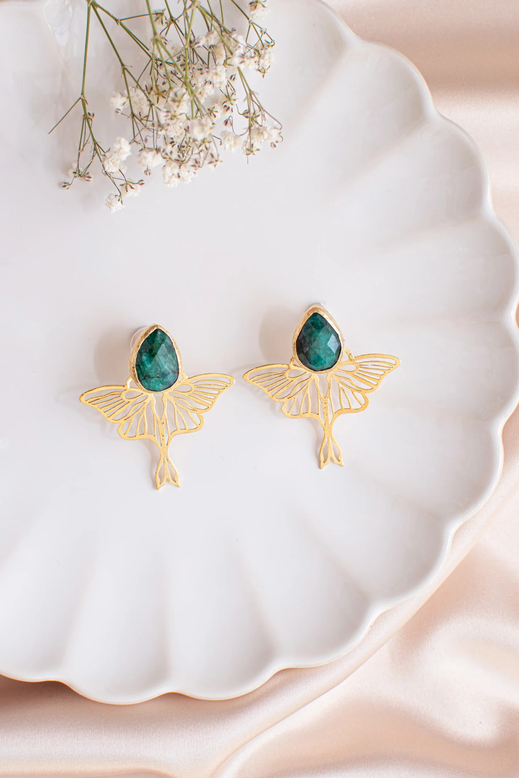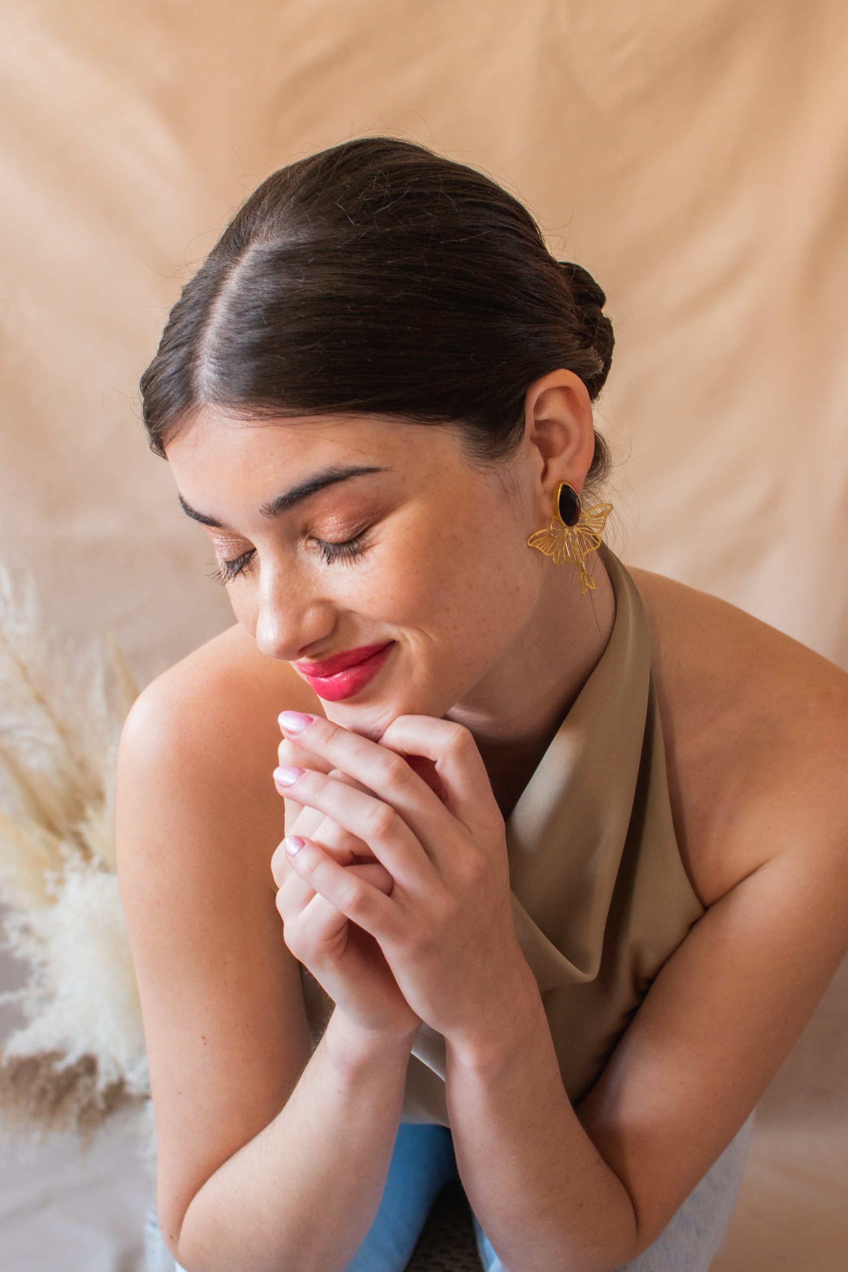 Pendientes hecho a mano en bronce con un ba帽o en oro 24k. Piedra natural. No pesan nada.