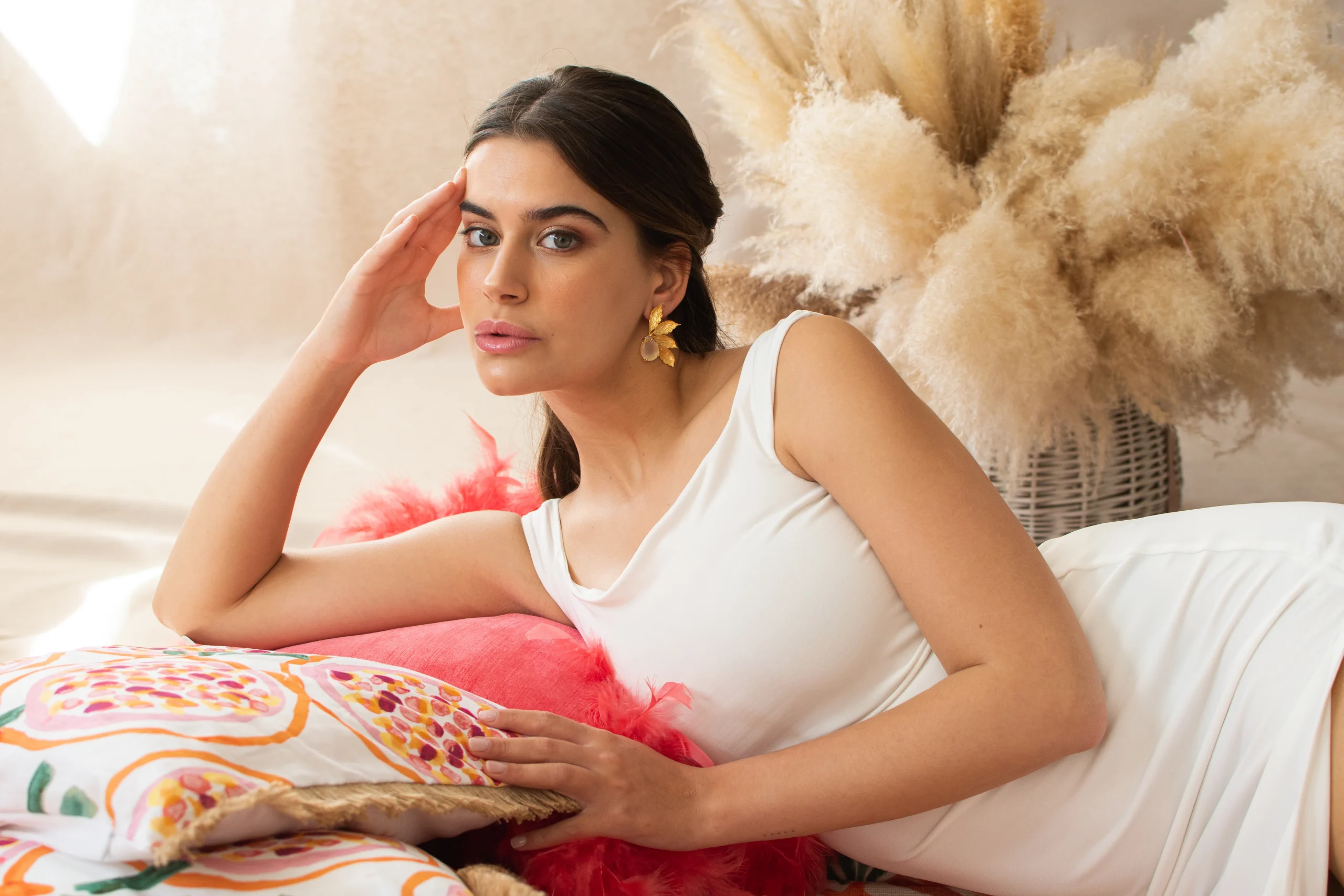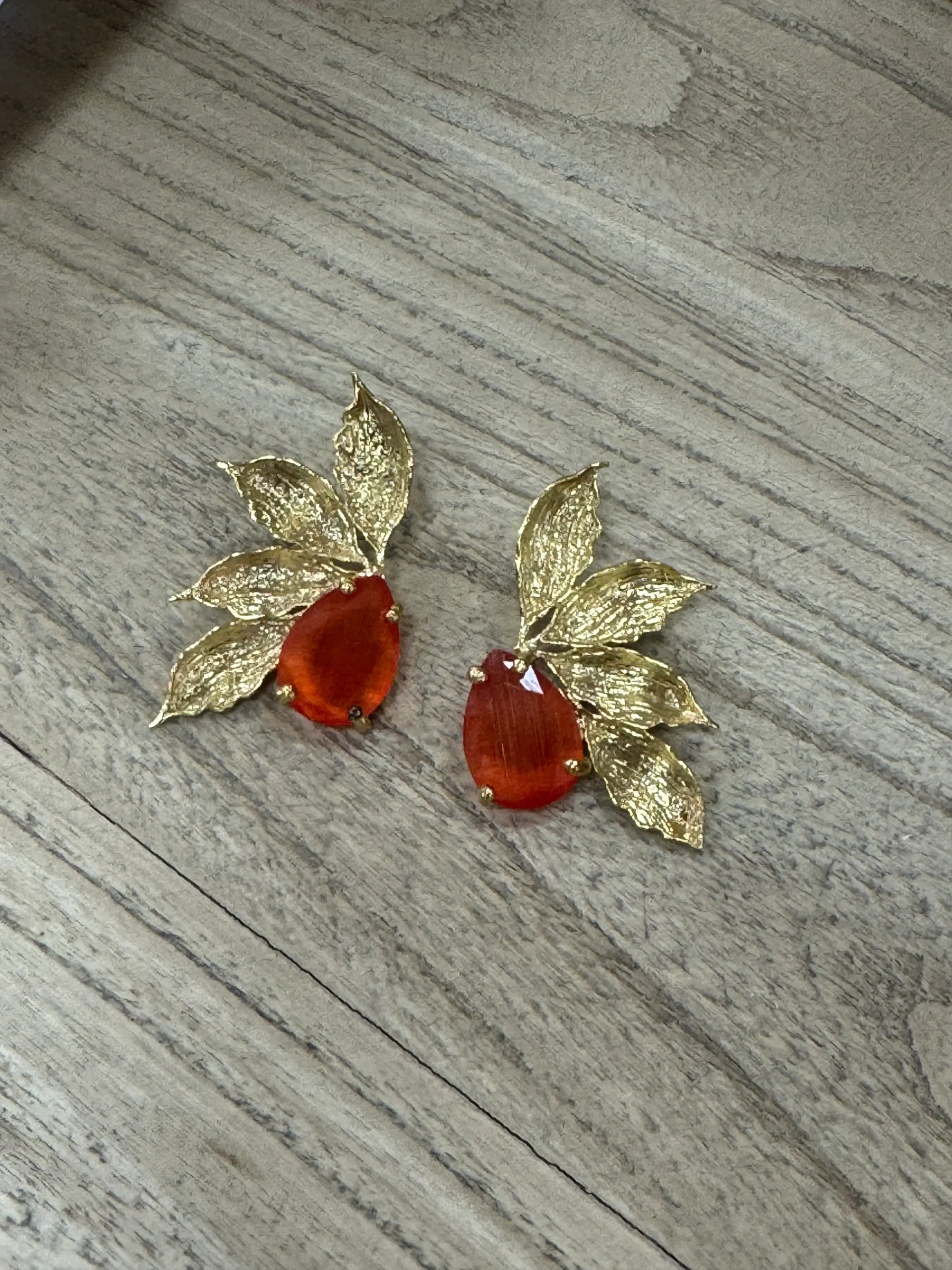 Pendientes hechos a mano en bronce con un ba帽o en oro y piedras naturales. No pesan nada . Llevan broche palito.
