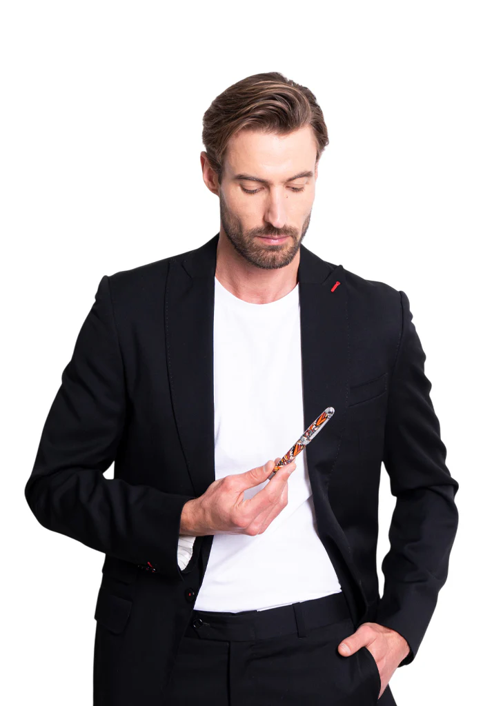Instrumento de escritura elaborado a mano. Punta tipo rollerball con tinta negra.