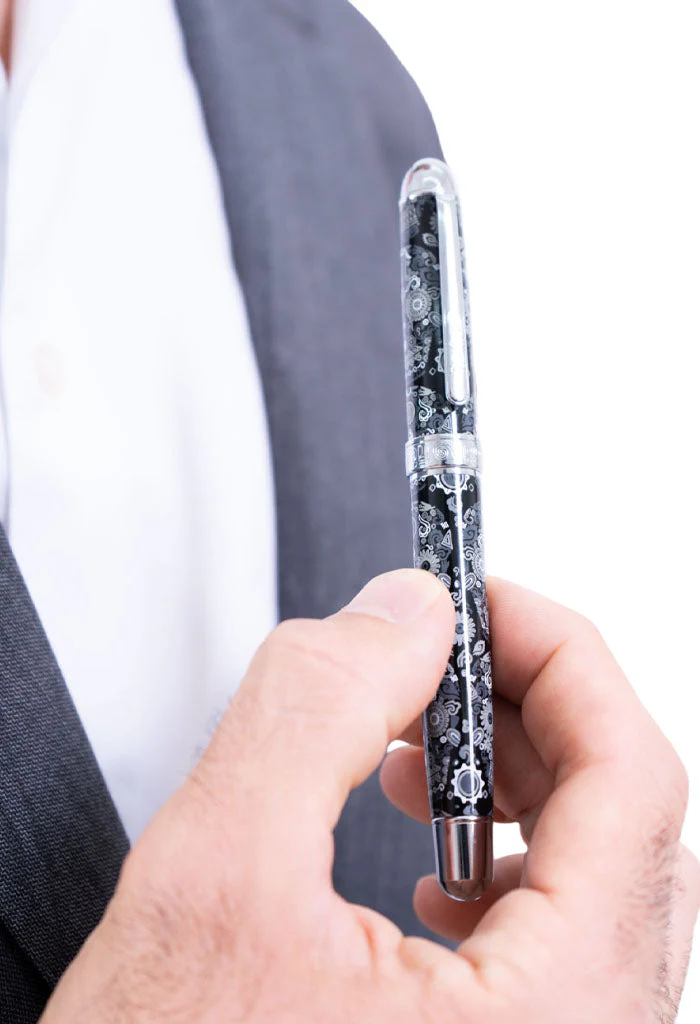 Instrumento de escritura elaborado a mano. Punta tipo rollerball con tinta negra.