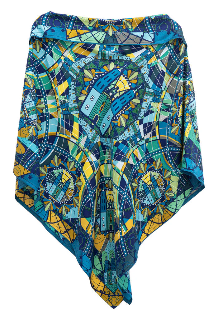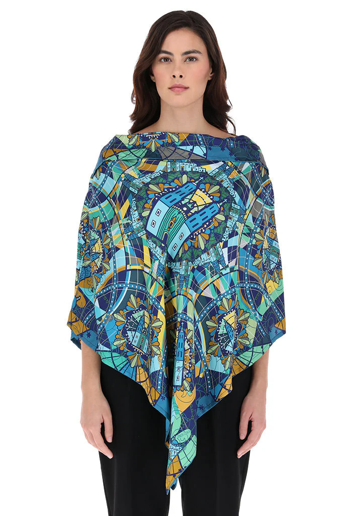 Poncho estampado con escote recto y pliegue en la parte superior que le da un toque elegante y favorecedor. Prenda vers谩til para todas las tallas.