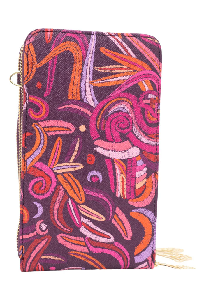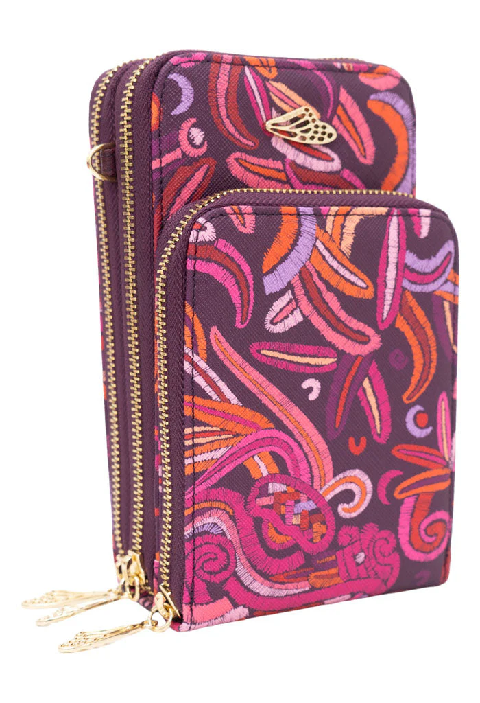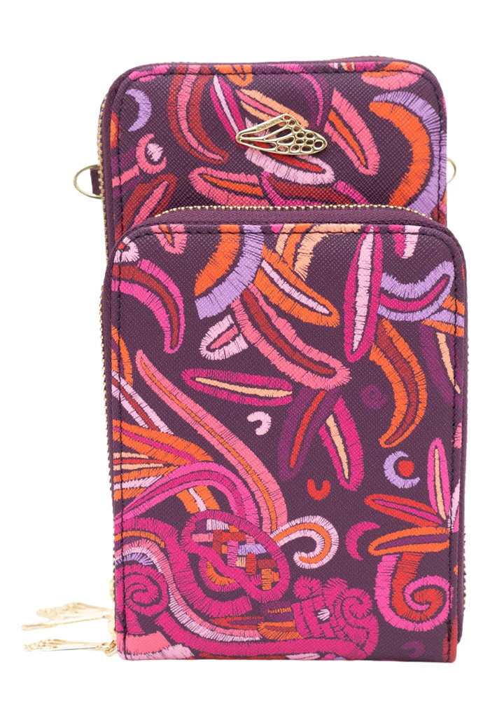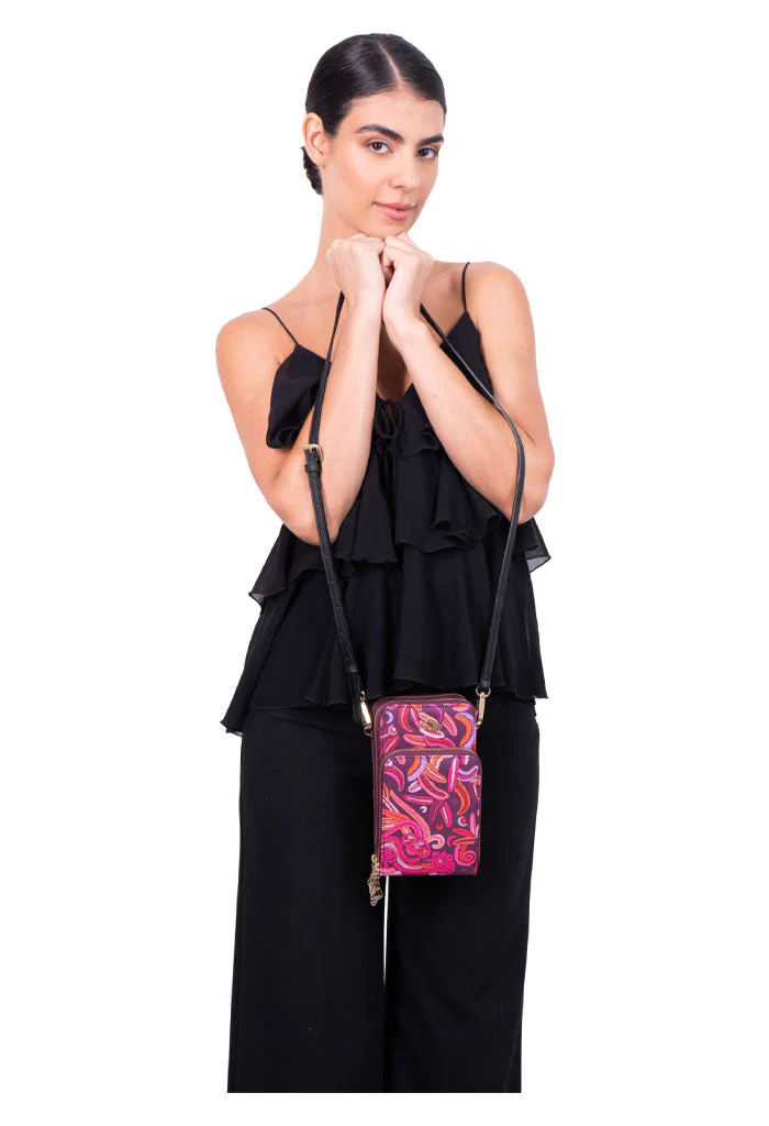 Naab, del maya ‘cuarta’. Bolsa para teléfono celular estilo crossbody en acabado saffiano con grabado. Cuenta con correa ajustable y compartimentos con cierre.