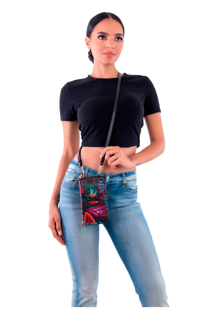 Peek, del maya ‘acci贸n’. Bolsa para tel茅fono celular estilo crossbody en acabado saffiano. Cuenta con correa ajustable y compartimento con cierre.