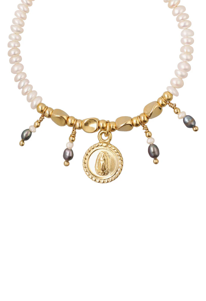驴No estoy yo aqu铆 que soy tu Madre? Era el 9 de diciembre de 1531 cuando ennla ma帽ana, en la cumbr del Tepeyac, la Guadalupana, Madre de todos los mexicanos, apareci贸 por primera vez frente alos ojos del ind铆gena macehual Juan Diego. En tiempos prehisp谩nicos, en el templo antiguo que se ubicaba en el Tepeyac, los aztecas veneraban y daban culto a la diosa Teotenantzin (Madre de los Dioses) o Cihuapilli Tonantzin (Noble indita, nuestra madre). Las apariciones de la Virgen en M茅xico comenzaron 10 a帽os despu茅s de la ca铆da y conquista de Tenochtitl谩n; en medio de una nube de blancura respandeciente, una se帽ora muy semejante a la que hoy se contampla en su bendita imagen, trajo su preciosa santa voluntad mensaje al obispo Zum谩rraga. El dise帽o en seda est谩 basado en las apariciones que la Virgen realiz贸 al m谩s peque帽o de sus hijos, Juan Diego. La conmemoraci贸n del milagro se celebra el 12 de diciembre; el dise帽o esta inspirado en un retablo del siglo XVII.