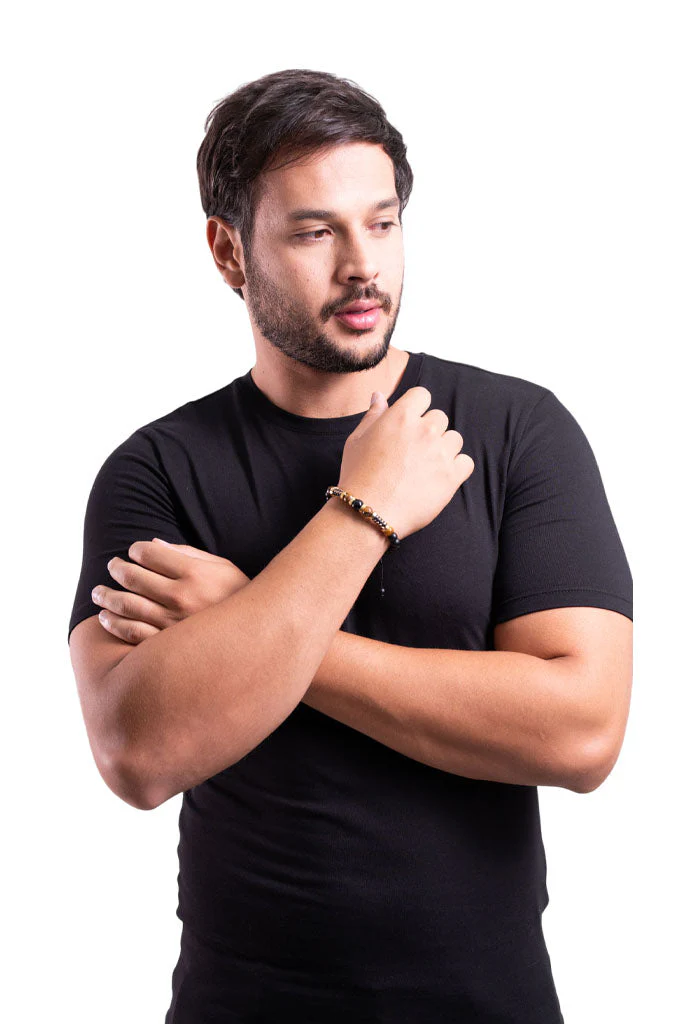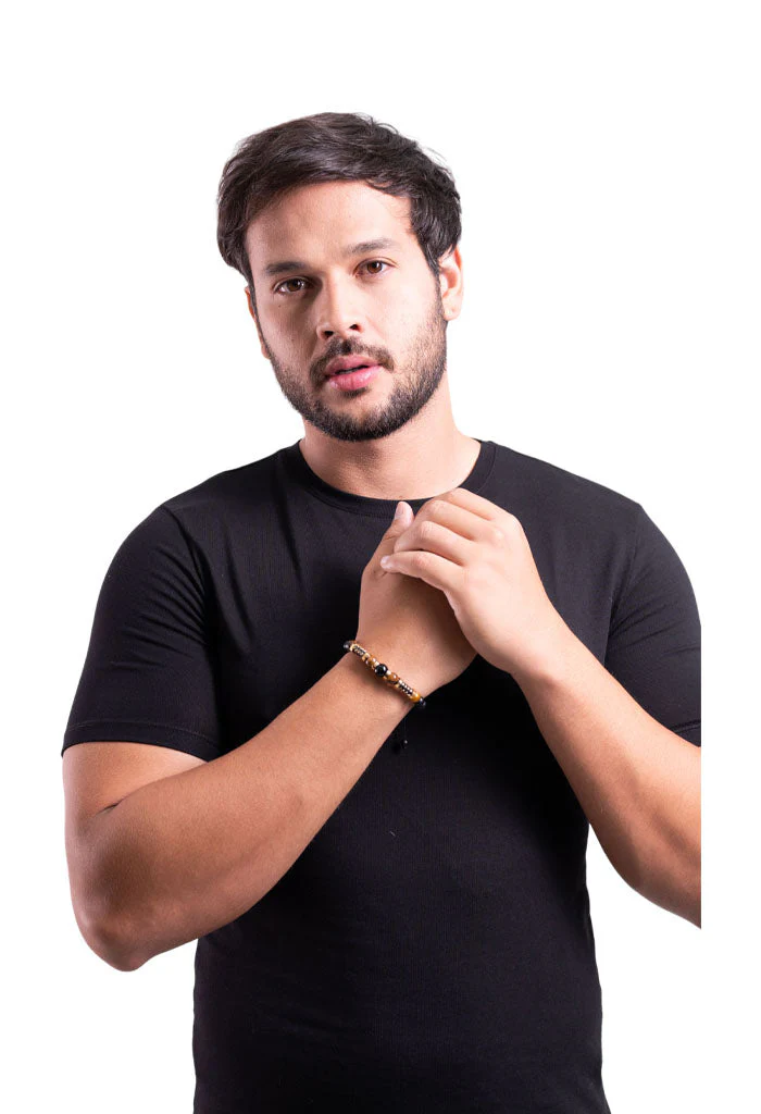 ágata negra mate, ágata negra brillosa, ojo de tigre café, caucho, acero inoxidable / terminado pvd dorado