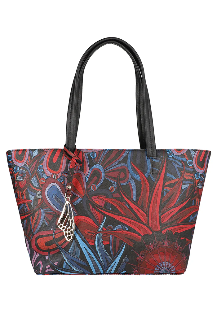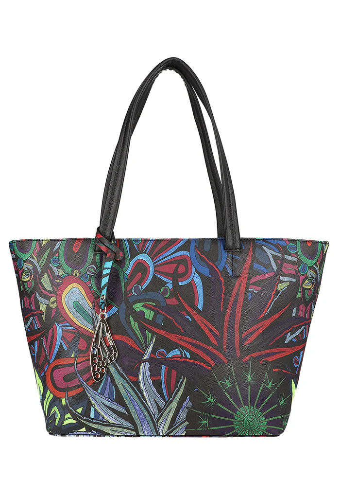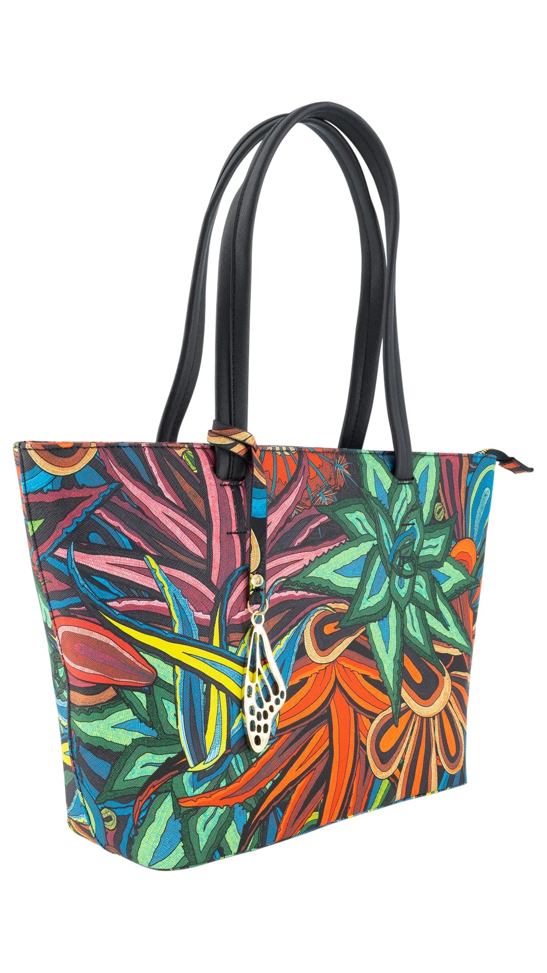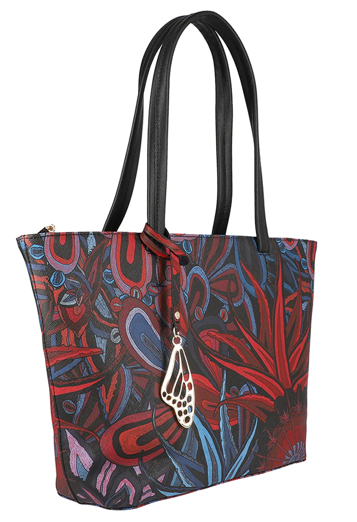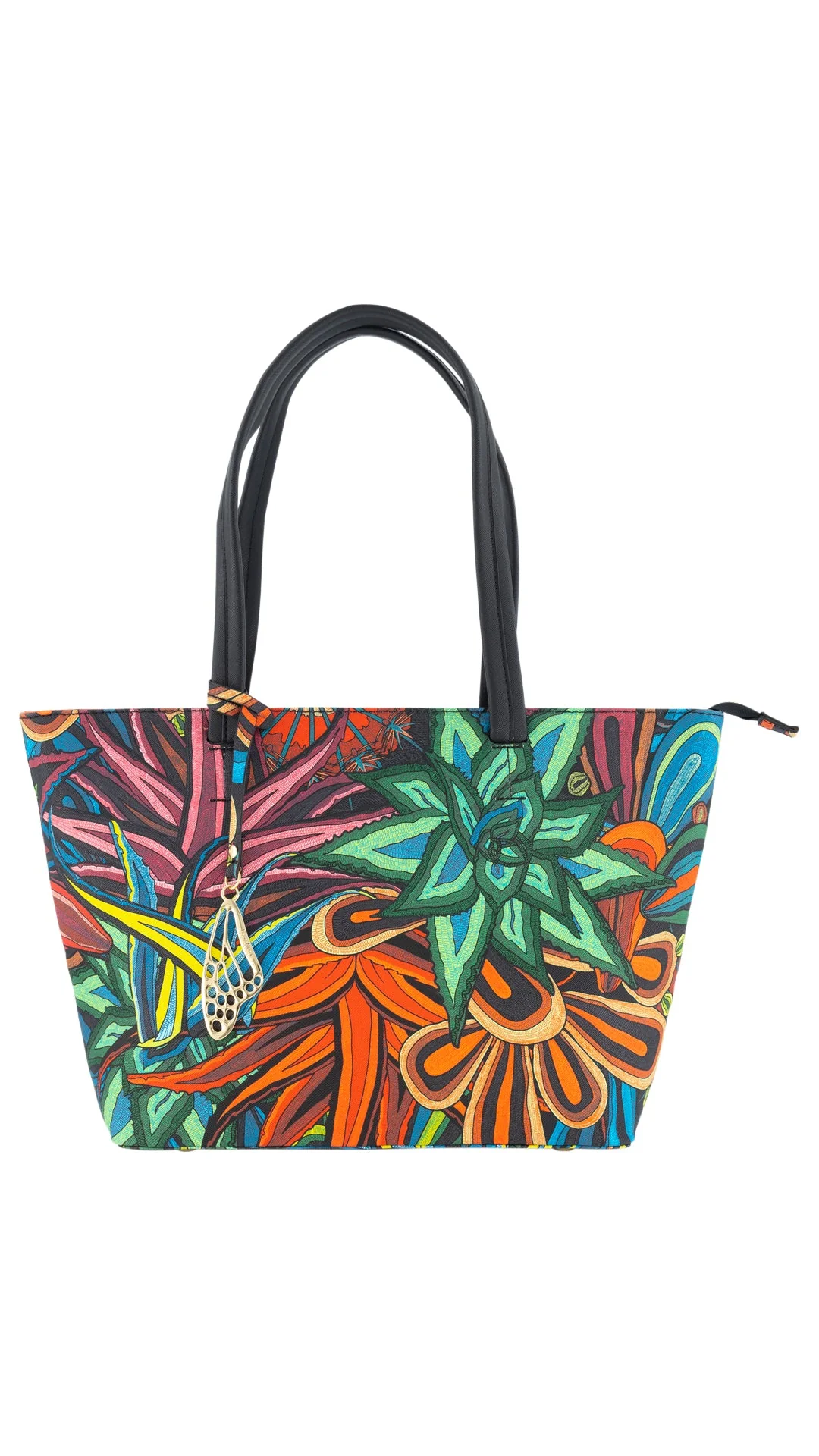 K’iin, del maya ‘sol’. Bolsa tipo tote en acabado estilo saffiano con asa doble. Incluye colgante met谩lico con la forma de un ala de mariposa.