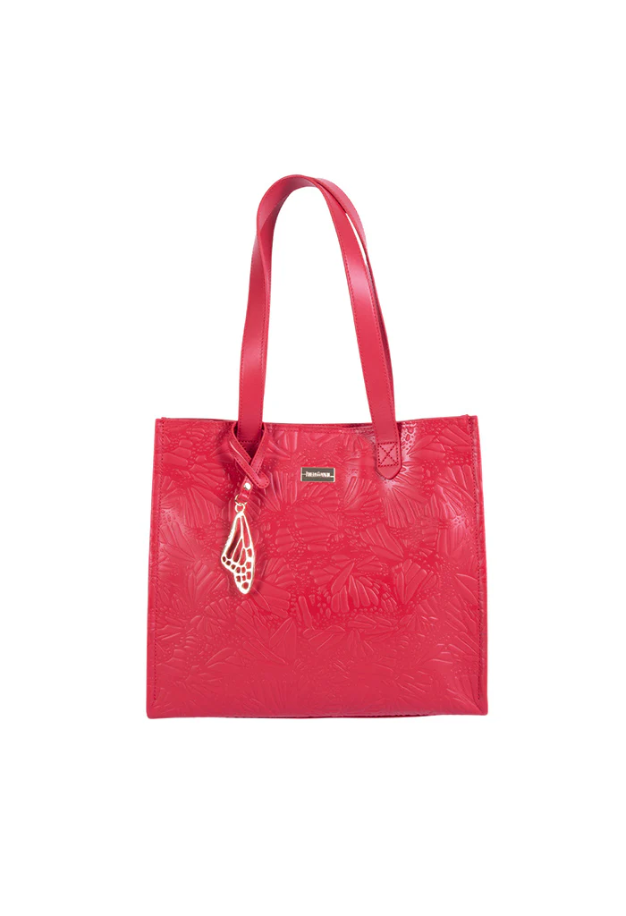 Bolsa tipo tote en acabado en piel con asa doble. Incluye colgante metálico con la forma de un ala de mariposa.